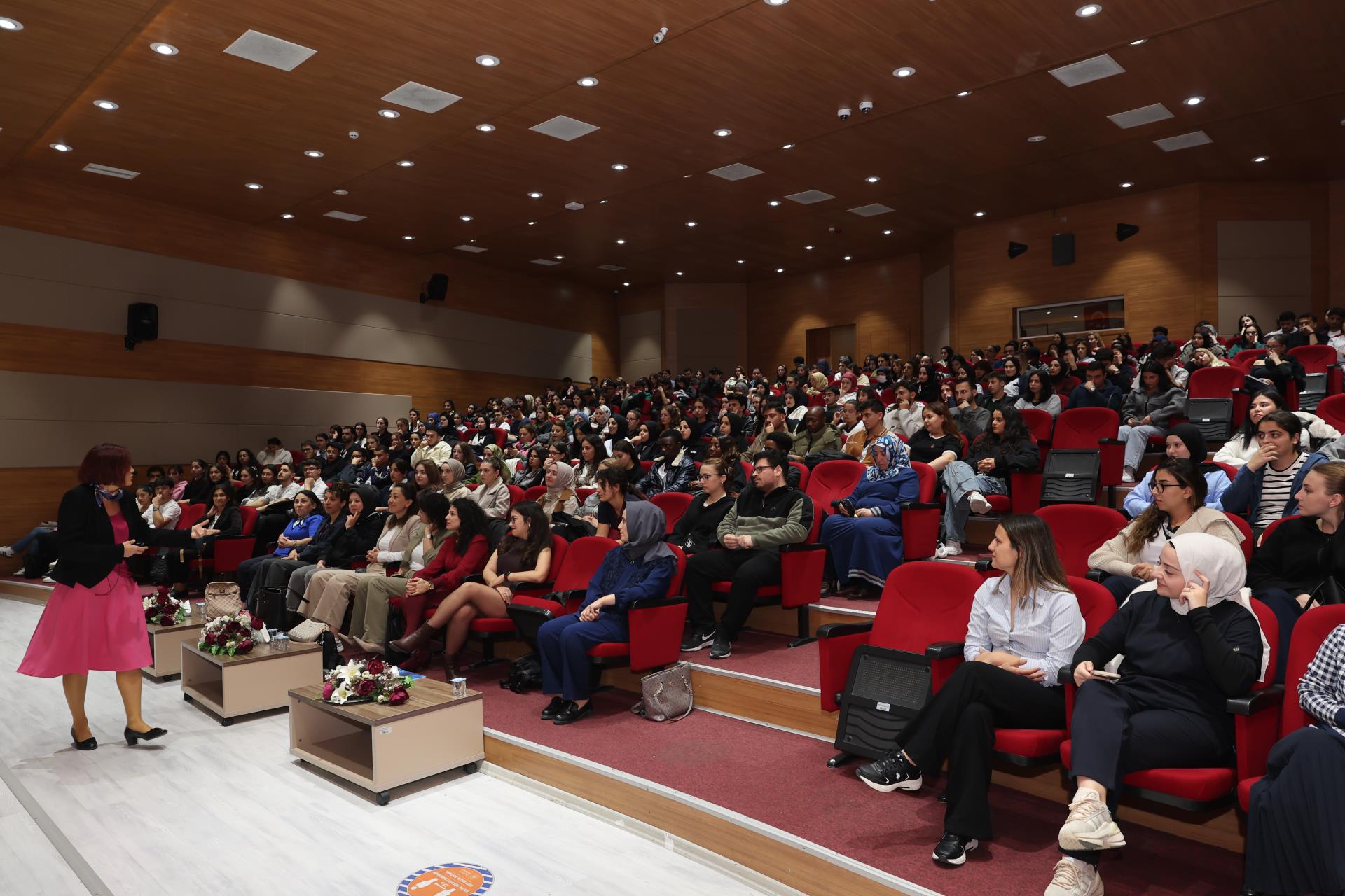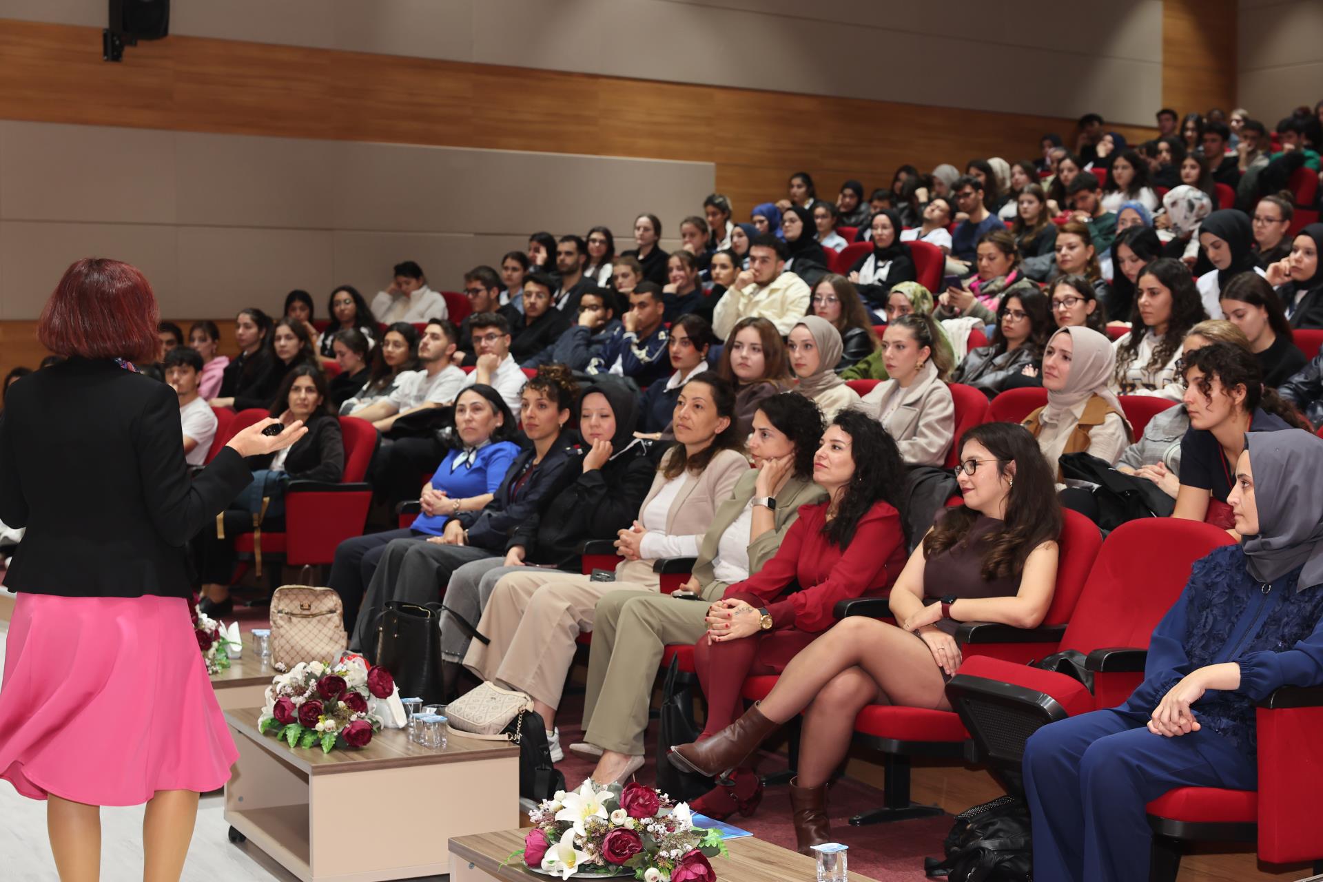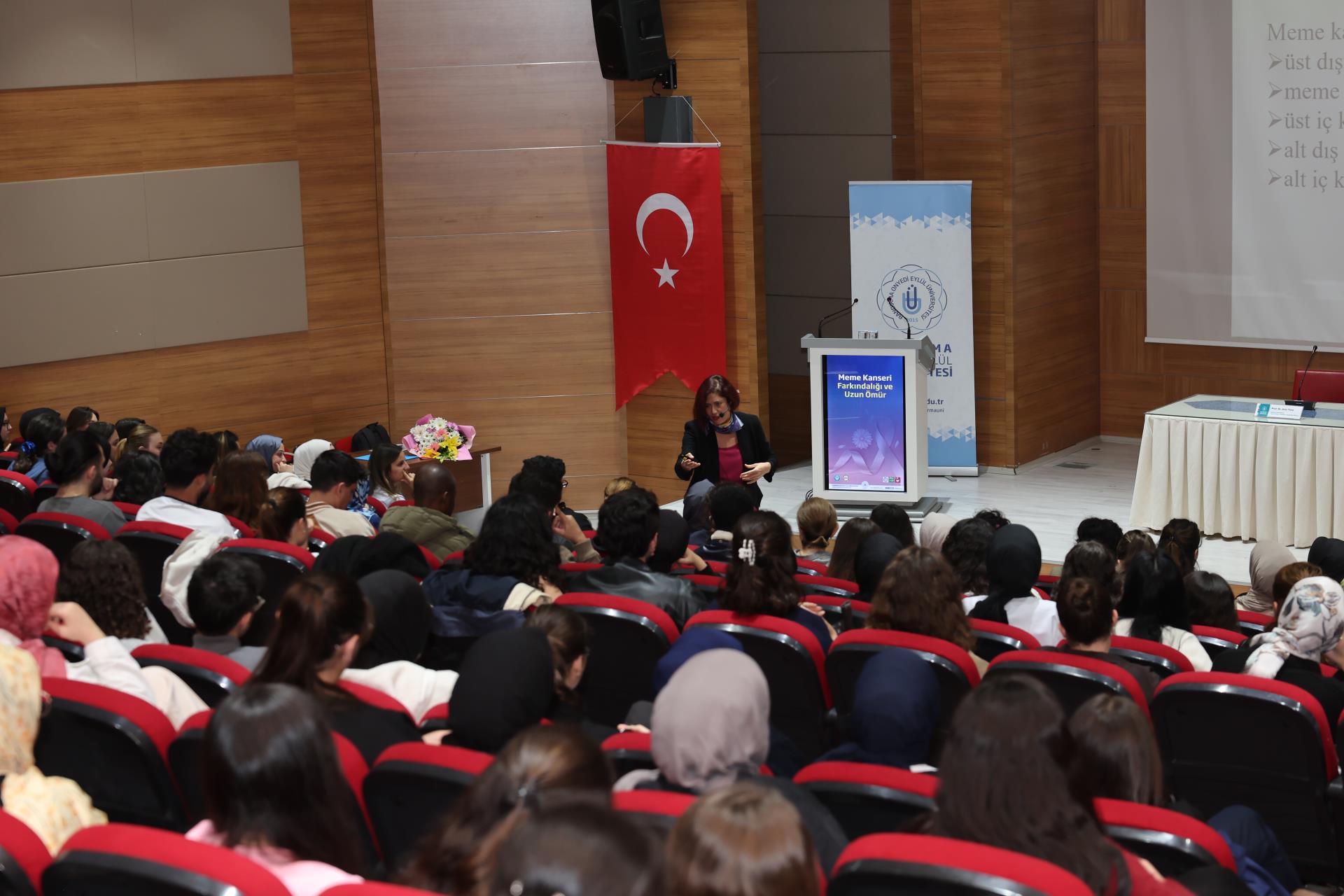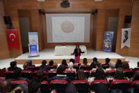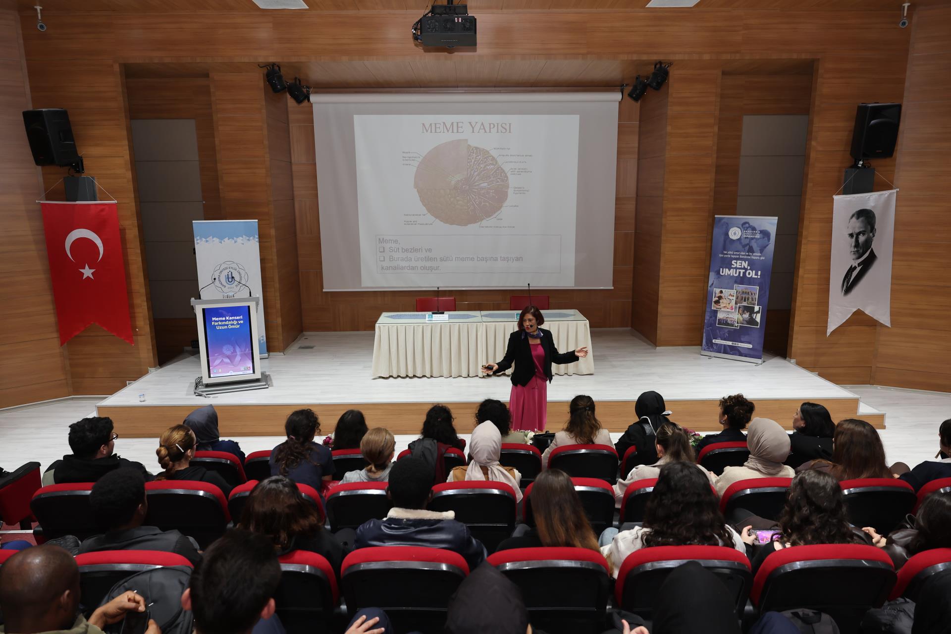 Konferansın konuşmacısı Balıkesir Üniversitesi Sağlık Bilimleri Fakültesi Hemşirelik Bölümü öğretim üyesi Prof. Dr. Arzu Tuna, 1–31 Ekim Meme Kanseri Farkındalık Ayı dolayısıyla gerçekleştirdiği sunumunda meme kanseri tanılama yöntemleri, tarama periyotları, risk faktörleri, belirtiler ve koruyucu önlemler hakkında kapsamlı bilgiler paylaştı. Tuna, öğrencilerle etkileşimli bir sunum gerçekleştirerek farkındalığın yalnızca kadınlar için değil, toplumun tüm bireyleri için taşıdığı önemi vurguladı.