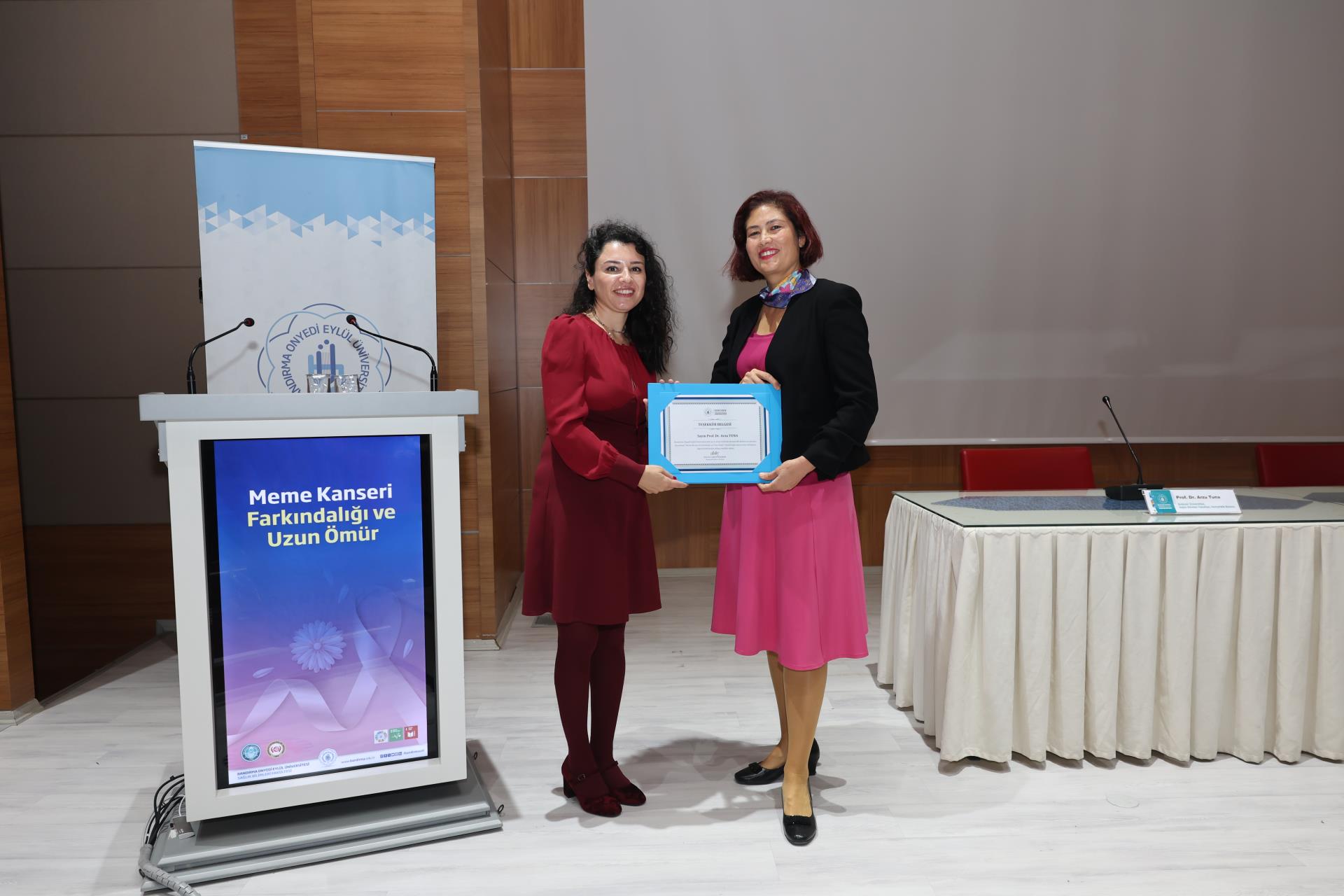 Etkinliğin sonunda, Hemşirelik Bölüm Başkanı Prof. Dr. Latife Utaş Akhan tarafından Prof. Dr. Arzu Tuna’ya katkılarından dolayı teşekkür belgesi takdim edildi.